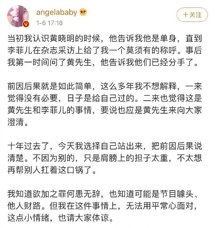 对此,baby也是不得不发出声明回应,baby表示当初认识黄晓明时他告诉自己他是单身,这么多年来不解释是觉得没必要,“要说也应是黄先生来向大家澄清”,今天站出来是因为“不太想再帮别人扛着这口锅了。”最后她还直言知道可能是节目噱头、他人财路,“但我在这件事情上,无法用平常心面对”。