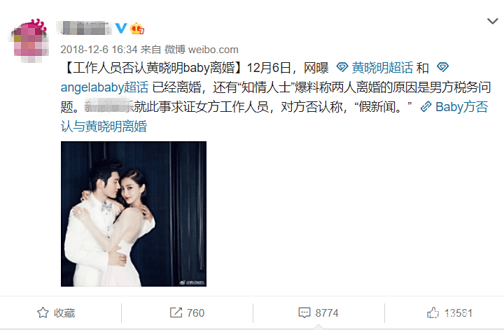 从夫妻俩正式升级成一家三口后,黄晓明与baby之间的感情在此后一段时间里愈发恩爱。 不过,从2018年开始,两人陆续开始传出婚变的消息,先是在2018年12月,黄晓明被传因税务问题与女方离婚,但女方工作人员第一时间否认称“假消息”。